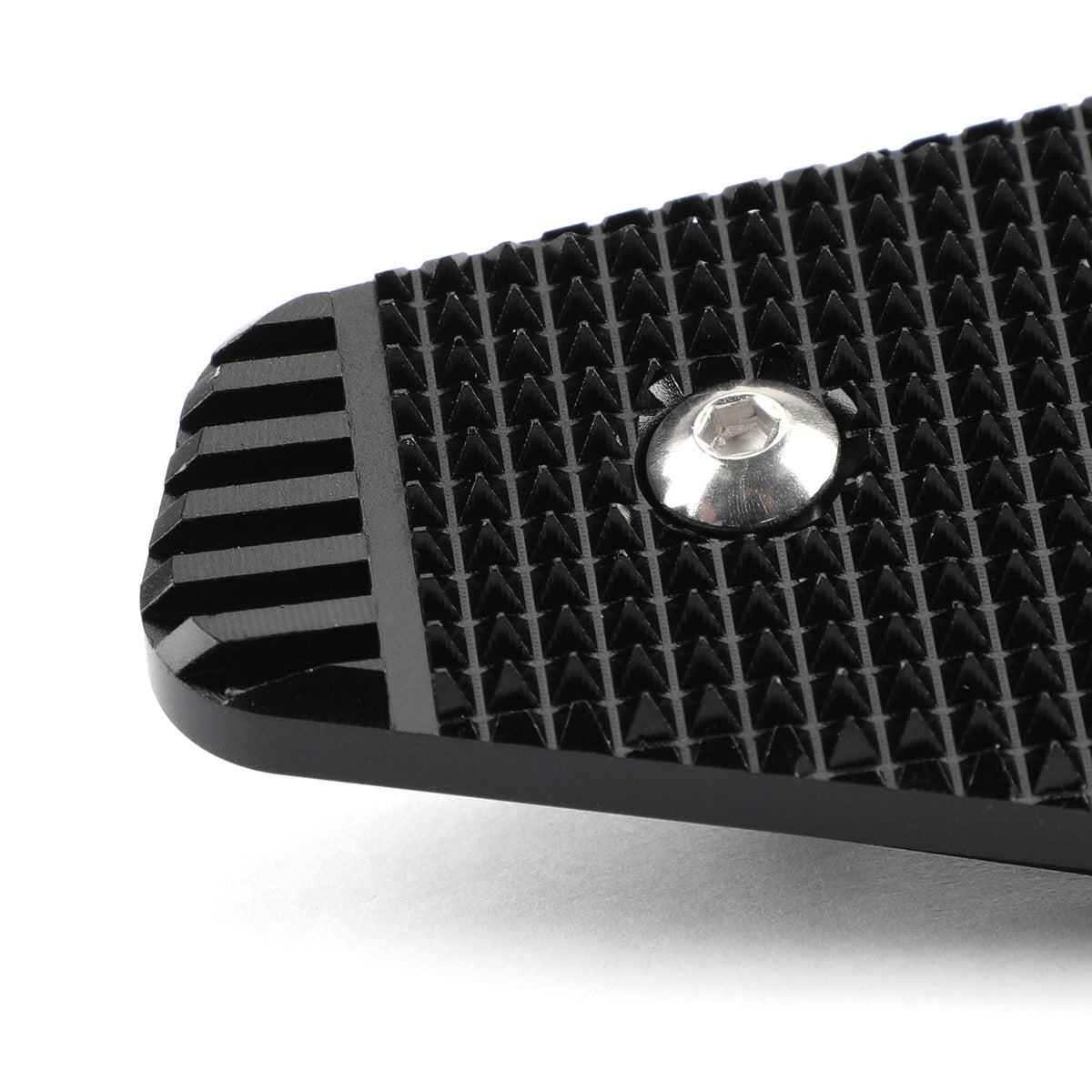 この機械加工されたアルミニウム プレートは、改造の必要なしにリア ブレーキ ペダルにボルトで固定するだけです。