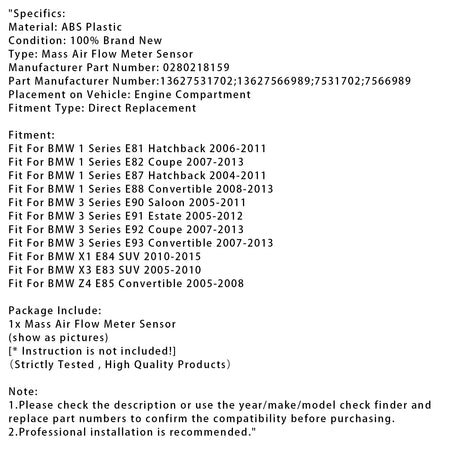 BMW E82 E87 E90 E91 E92 04-12 0280218159用マスエアフローメーターセンサー