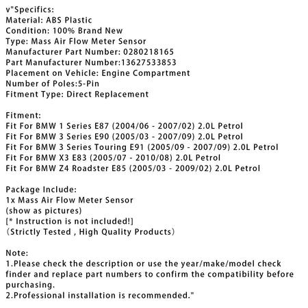 BMW E90 E91 E87 E83 Z4 0280218165用マスエアフローメーターセンサー