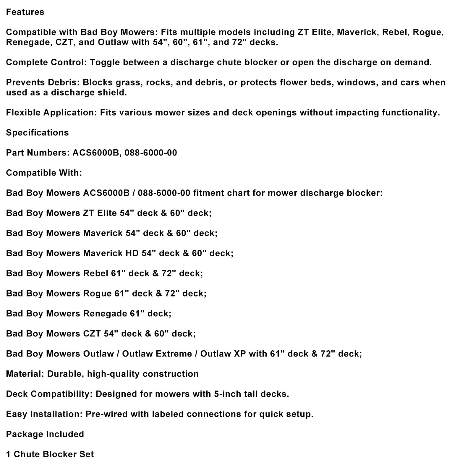 Bad Boy Mowers ACS6000B / 088-6000-00 芝刈り機排出ブロッカーの適合表: