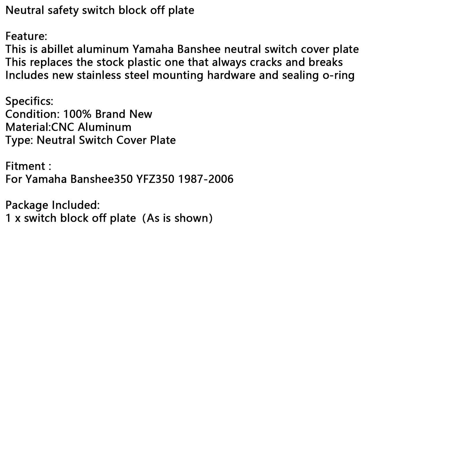 1987-2006 ヤマハ バンシー 350 YFZ350 ニュートラル セーフティ スイッチ ブロック オフ プレート