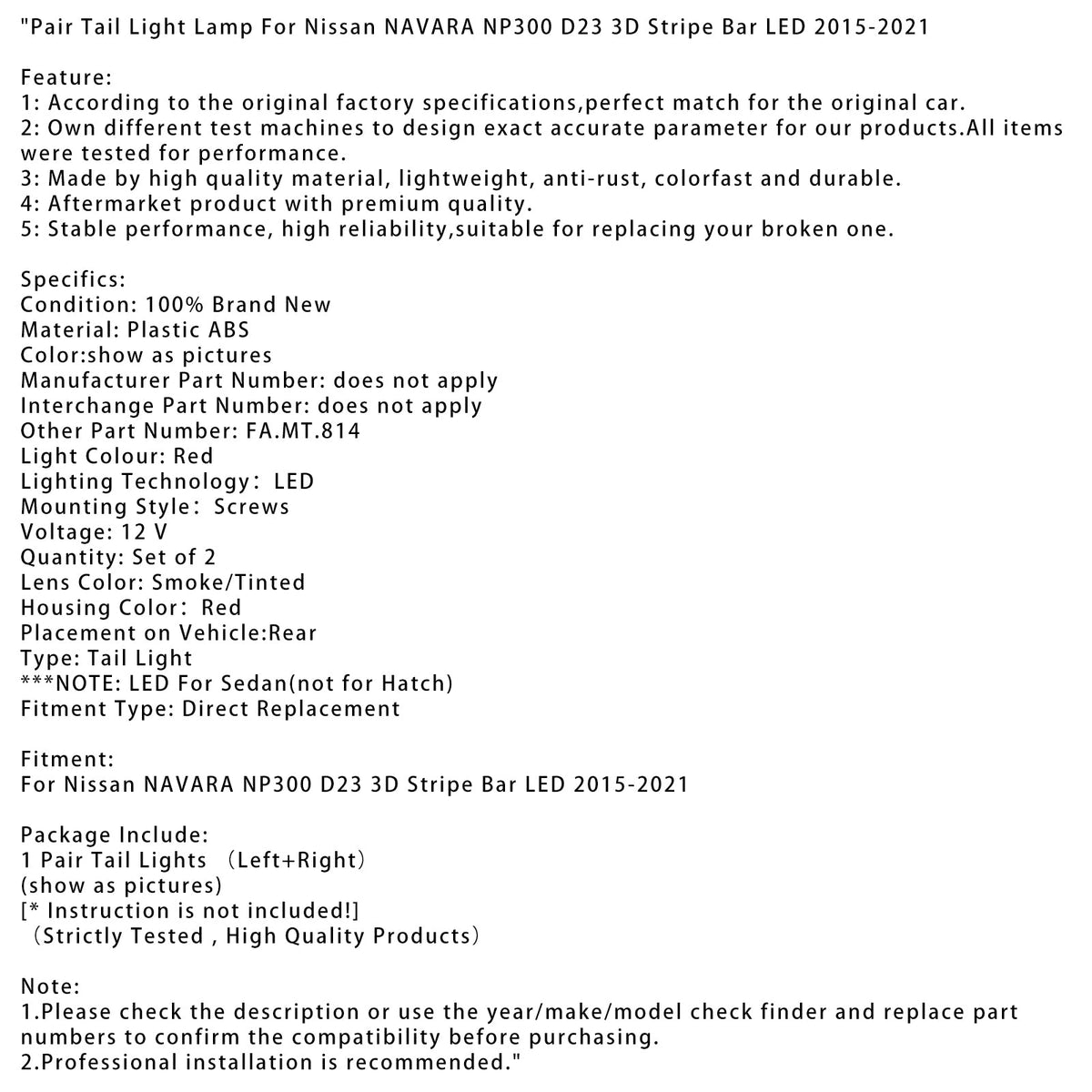 2015-2021 日産 ナバラ NP300 D23 3D ストライプ バー LED ペア テール ライト ランプ