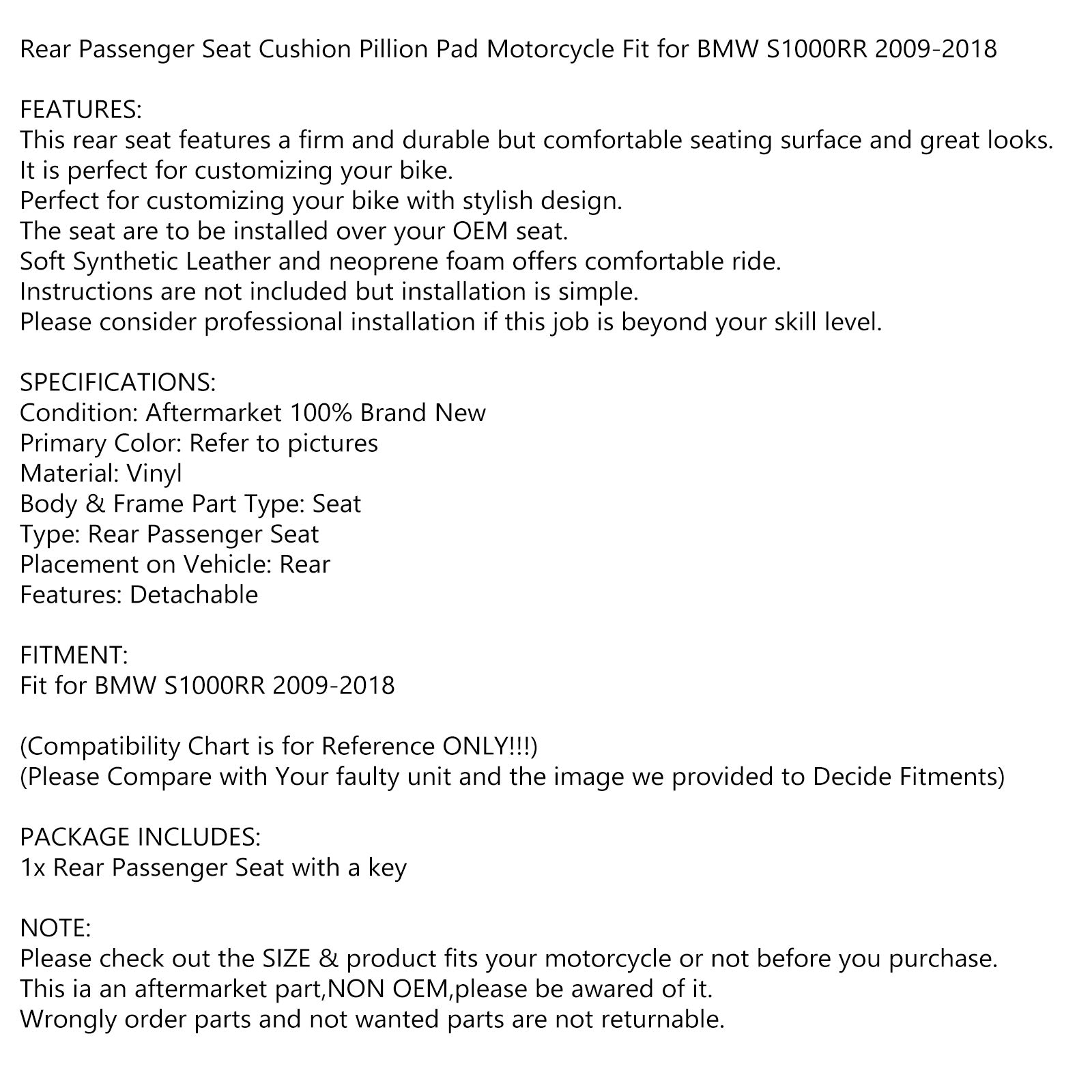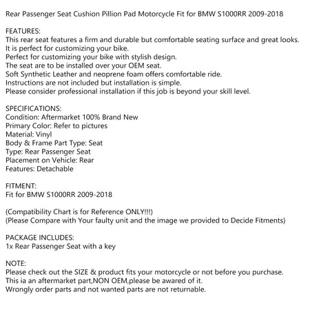 2009-2018 BMW S1000RR リア パッセンジャー シート ピリオン サドル ジェネリック