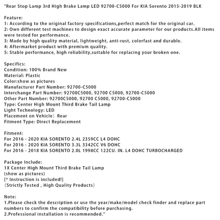 リアストップランプ 3rd ハイブレーキランプ LED 92700-C5000 KIA Sorento 2015-2019 BLK用