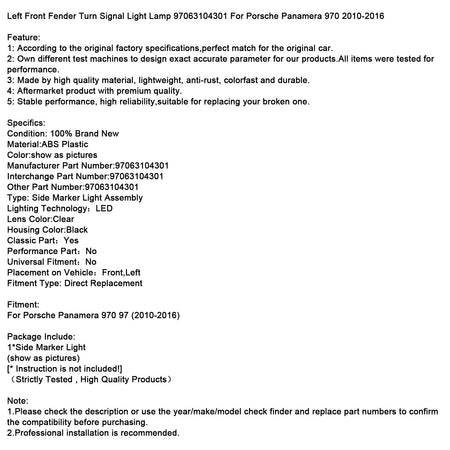 ポルシェ パナメーラ 970 2010-2016 用 右フロントフェンダー ターンシグナルライトランプ 97063104401