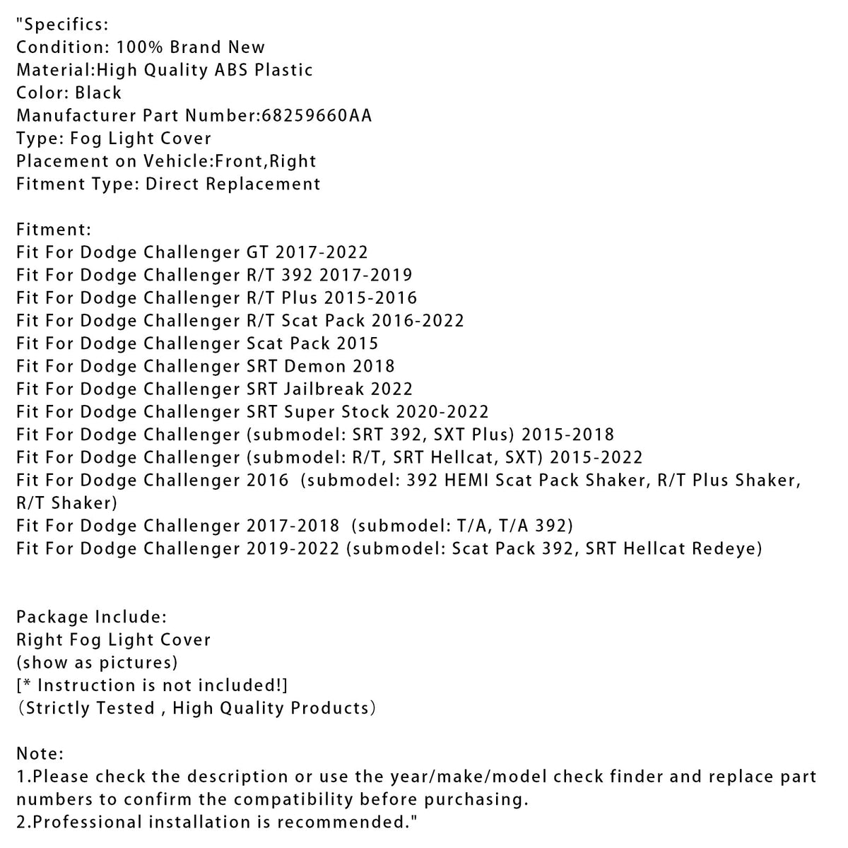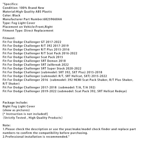 ダッジ チャレンジャー 2015-2022 68259660AA 用 右側フォグランプカバー