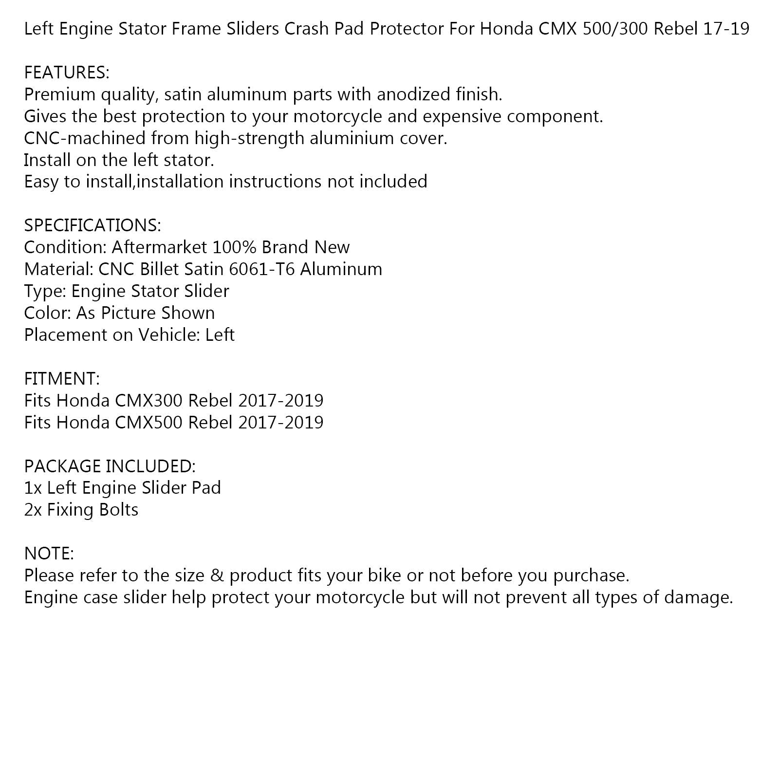 左エンジンステーターフレームスライダークラッシュパッドプロテクターホンダCMX 500/300 Rebel 17-19用