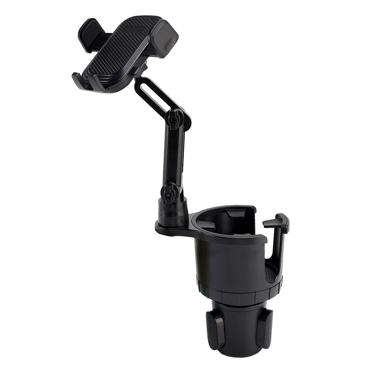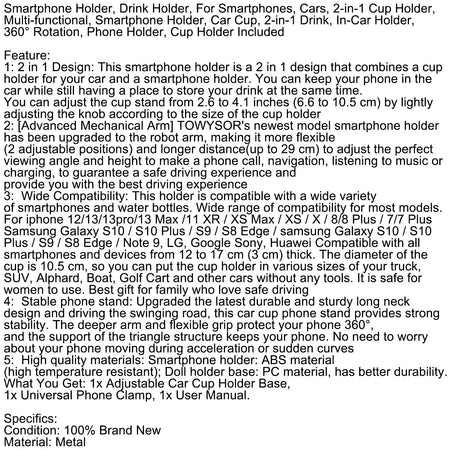 1:2 in 1デザイン:このスマホホルダーは、車用のカップホルダーとスマホホルダーを組み合わせた2 in 1デザインです。車内で携帯電話を保管しながら、同時に飲み物を置く場所を確保できます。カップホルダーのサイズに合わせてノブを軽く調整することで、カップスタンドを6.6cmから10.5cmまで調整できます。