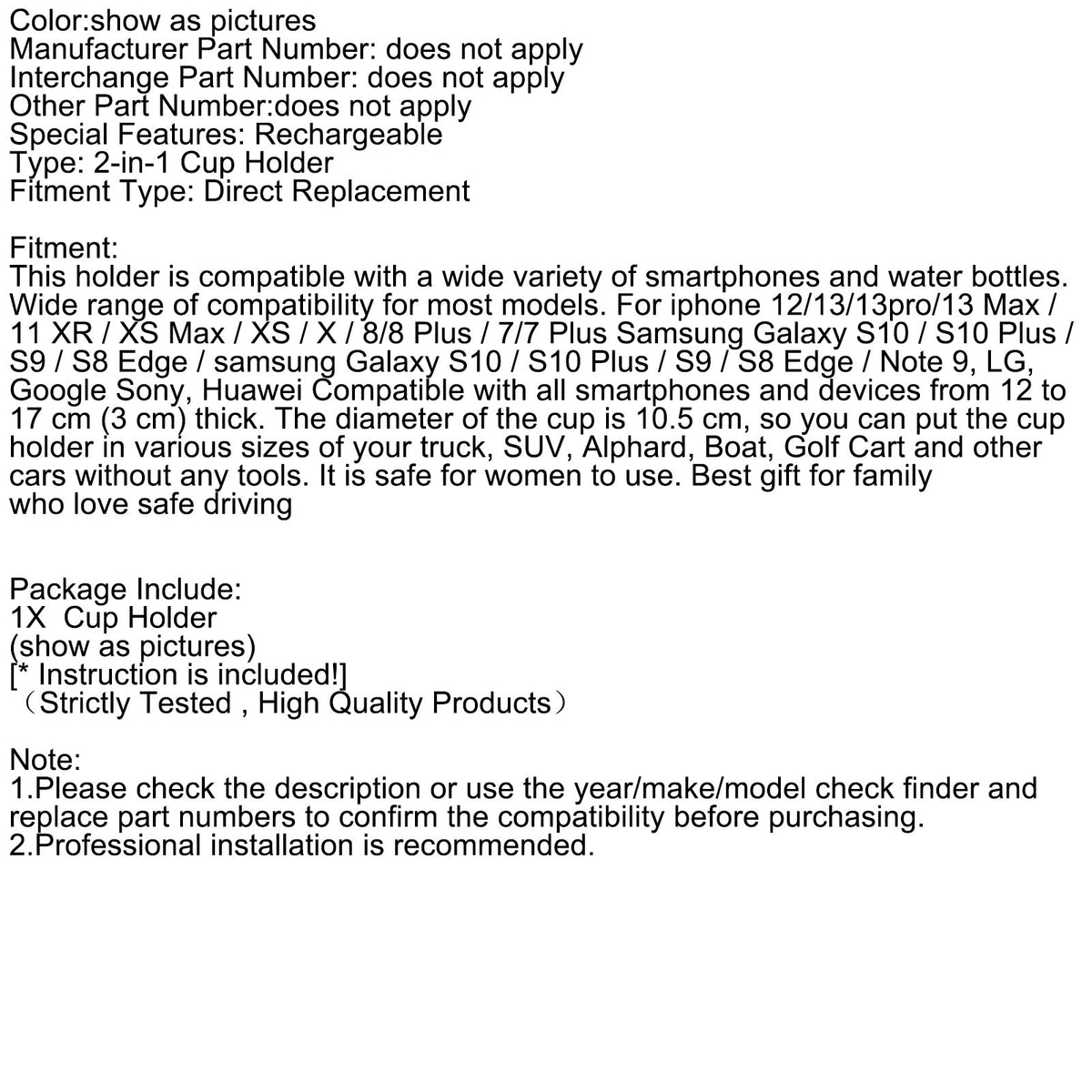 このホルダーは、さまざまなスマートフォンやウォーターボトルと互換性があります。ほとんどのモデルに幅広く対応しています。iphone 12/13/13pro/13 Max /11 XR / XS Max / XS / X / 8/8 Plus / 7/7 Plus、Samsung Galaxy S10 / S10 Plus / S9 / S8 Edge / samsung Galaxy S10 / S10 Plus / S9 / S8 Edge / Note 9、LG、Google、Sony、Huawei。厚さ12〜17cm (3cm) のすべてのスマートフォンとデバイスと互換性があります。カップの直径は10.5cmなので、ツールなしで、トラック、SUV、アルファード、ボート、ゴルフカートなどのさまざまなサイズの車にカップホルダーを取り付けることができます。女性でも安全に使用できます。安全運転を愛する家族への最高の贈り物