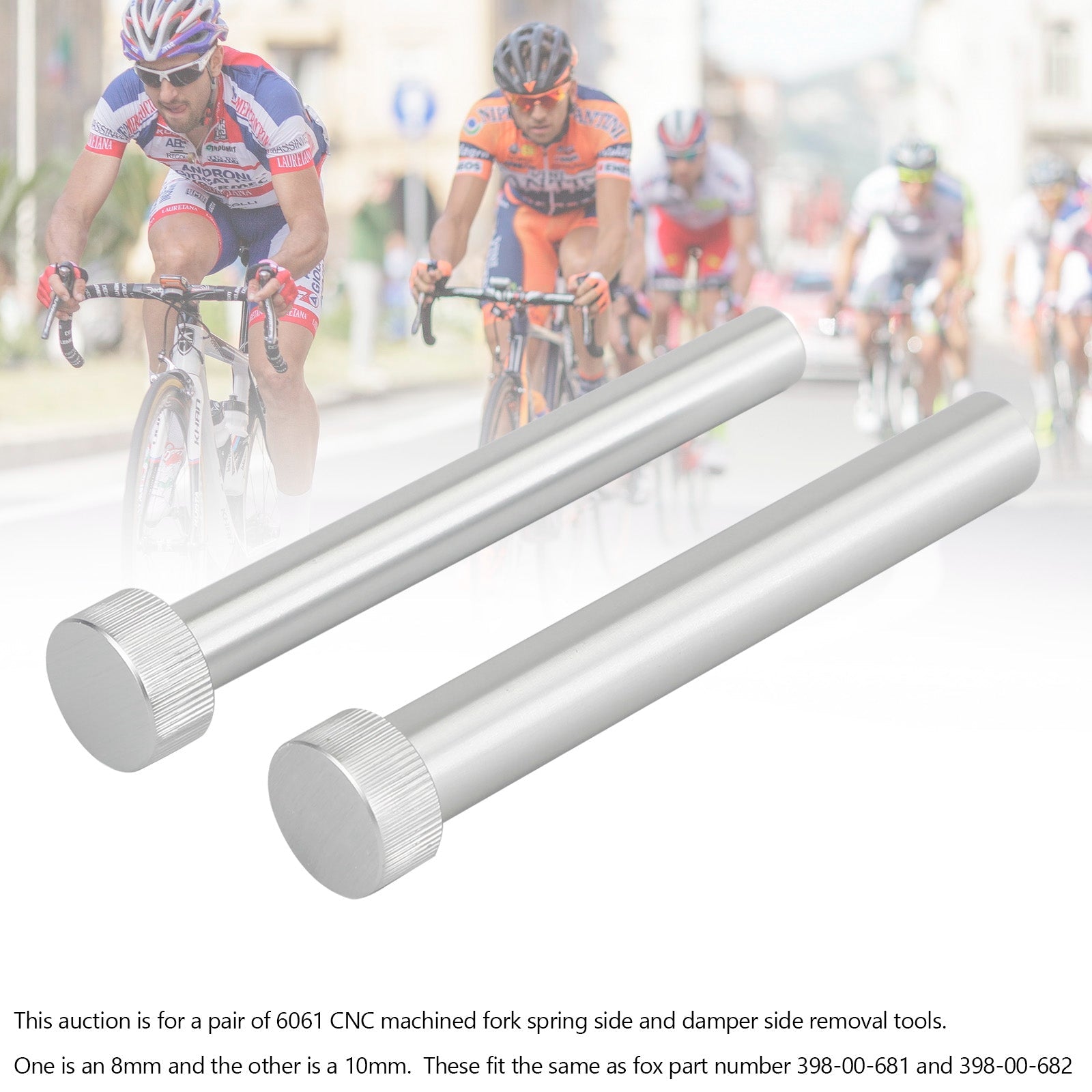 このオークションは、6061 CNC 機械加工フォーク スプリング サイドおよびダンパー サイド取り外しツールのペアです。1 つは 8mm、もう 1 つは 10mm です。これらは、Fox 部品番号 398-00-681 および 398-00-682 と同じものです。