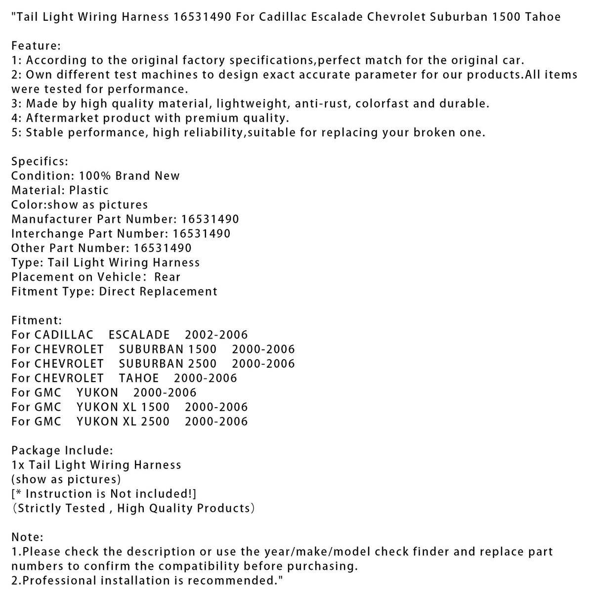 テールライト配線ハーネス 16531490 キャデラック エスカレード シボレー サバーバン 1500 タホ用