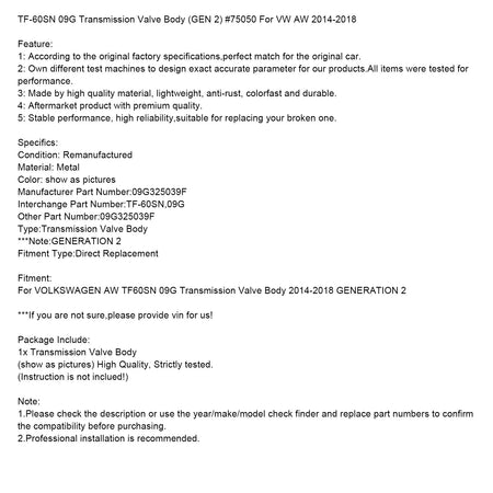 2014-2018 フォルクスワーゲン AW ジェネレーション 2 TF-60SN 09G トランスミッション バルブ ボディ (GEN 2) #75050
