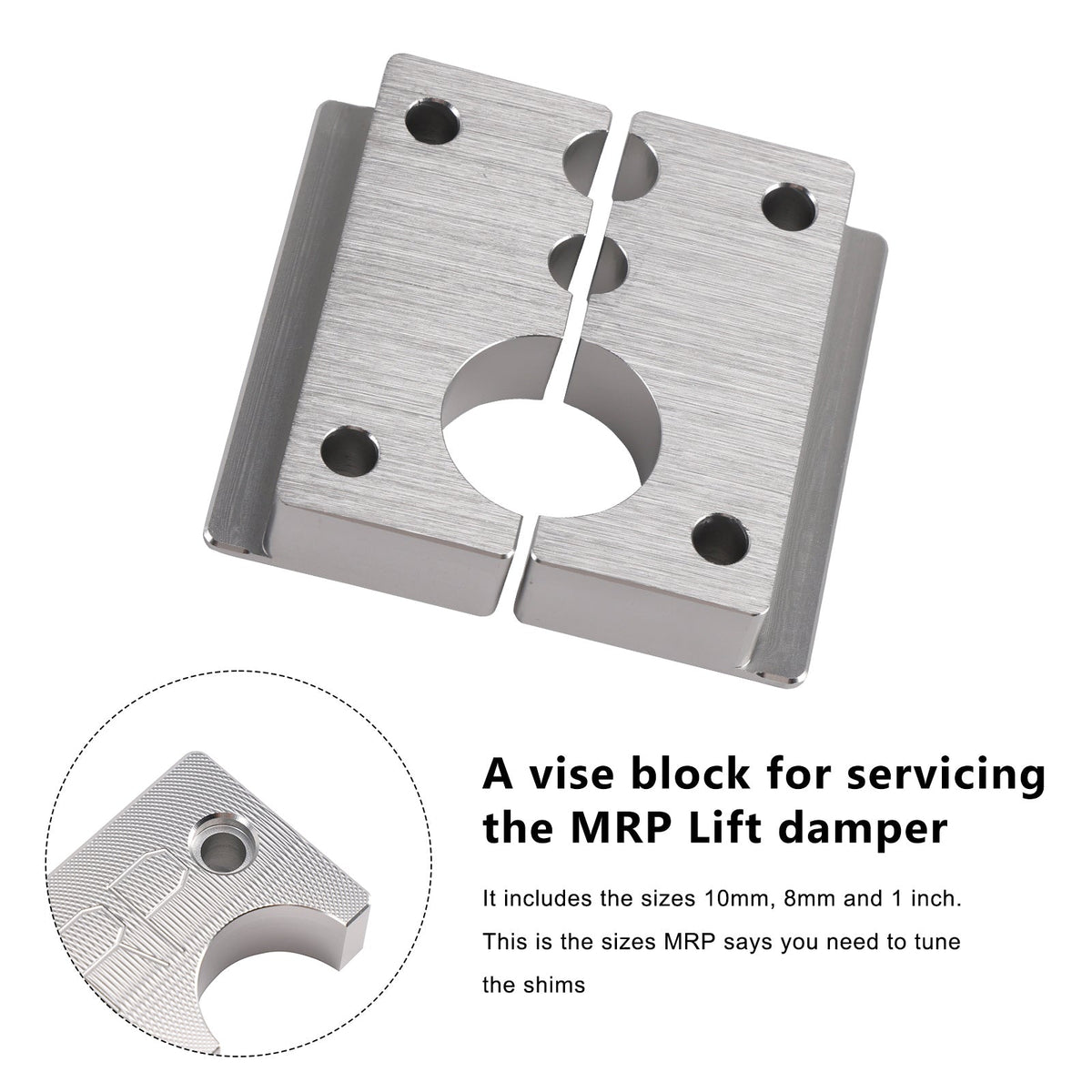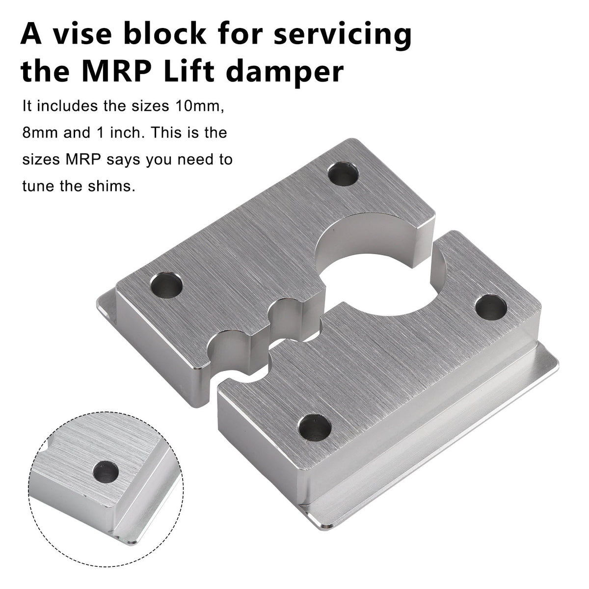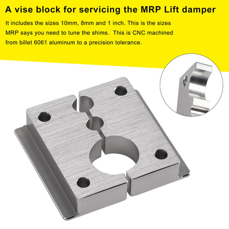 これはMRPリフトダンパーのメンテナンス用のバイスブロックです。10mm、8mm、1インチのサイズが揃っています。MRPによると、シム調整に必要なサイズです。6061ビレットアルミニウムからCNC加工で精密な公差で製造されています。