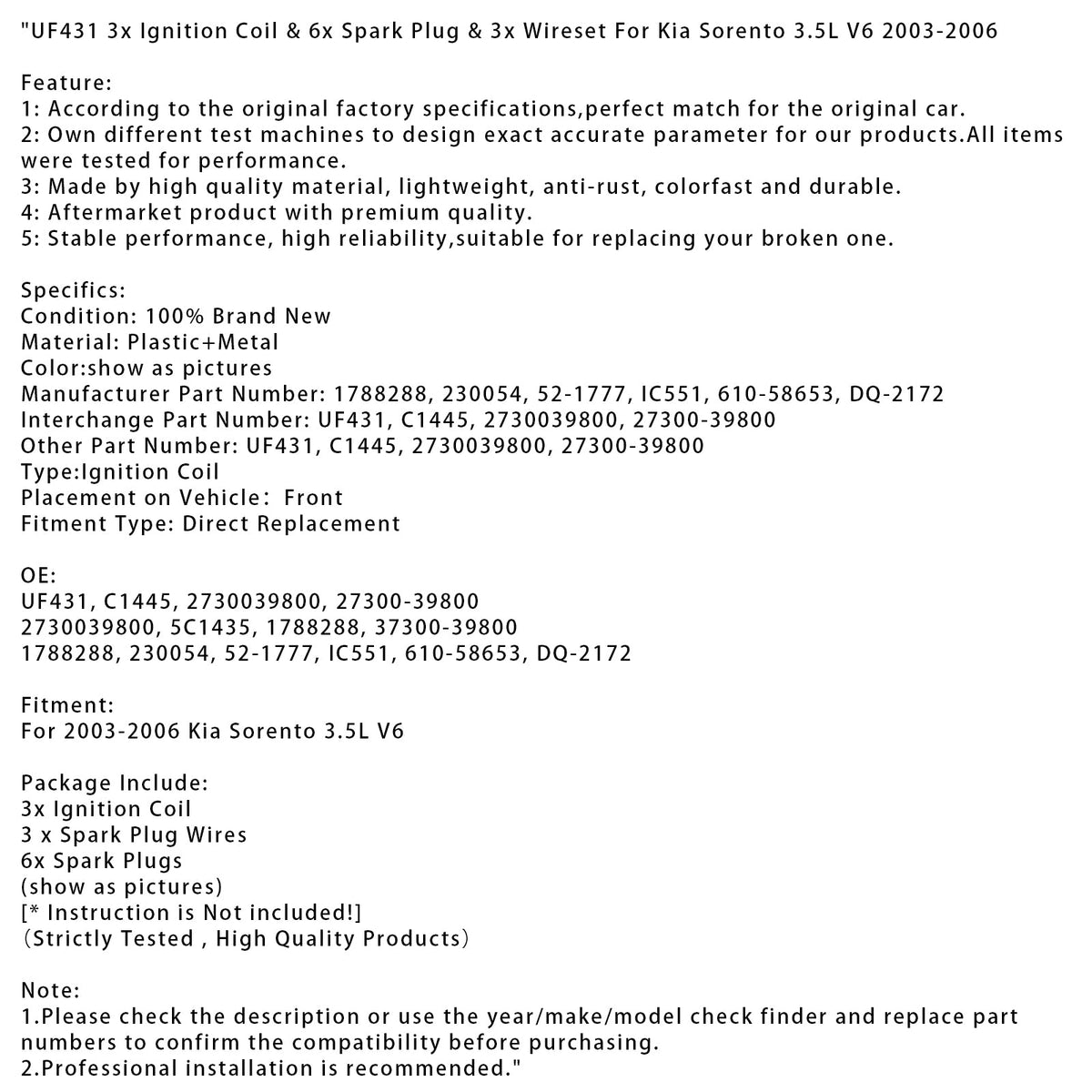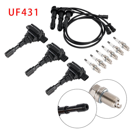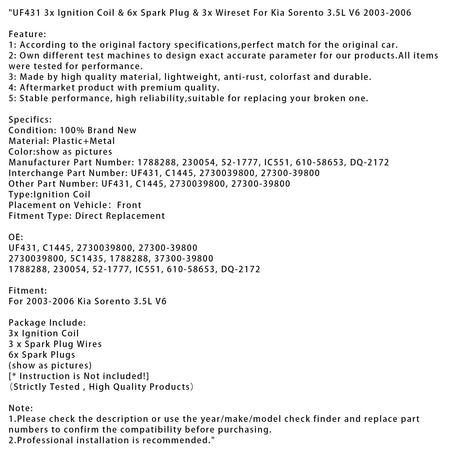 UF431 イグニッションコイル 3個 & スパークプラグ 6個 & ワイヤーセット 3個 Kia Sorento 3.5L V6 2003-2006 用